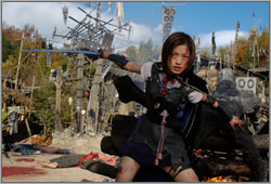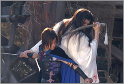 Azumi is a likeable character throughout the movie. She does her job and she does it well. However, she slowly begins to question her actions as the movie progresses. Who are the people she is trying to kill and why is she trying to kill them? She faithfully obeys her master until one of her companions is fatally wounded. Staying behind with one of her friends, Hyuga, to nurse their dying friend, Azumi realizes that this is not the life she wants. However, her dying friend, understanding the reason why they are staying behind, ends his own life.